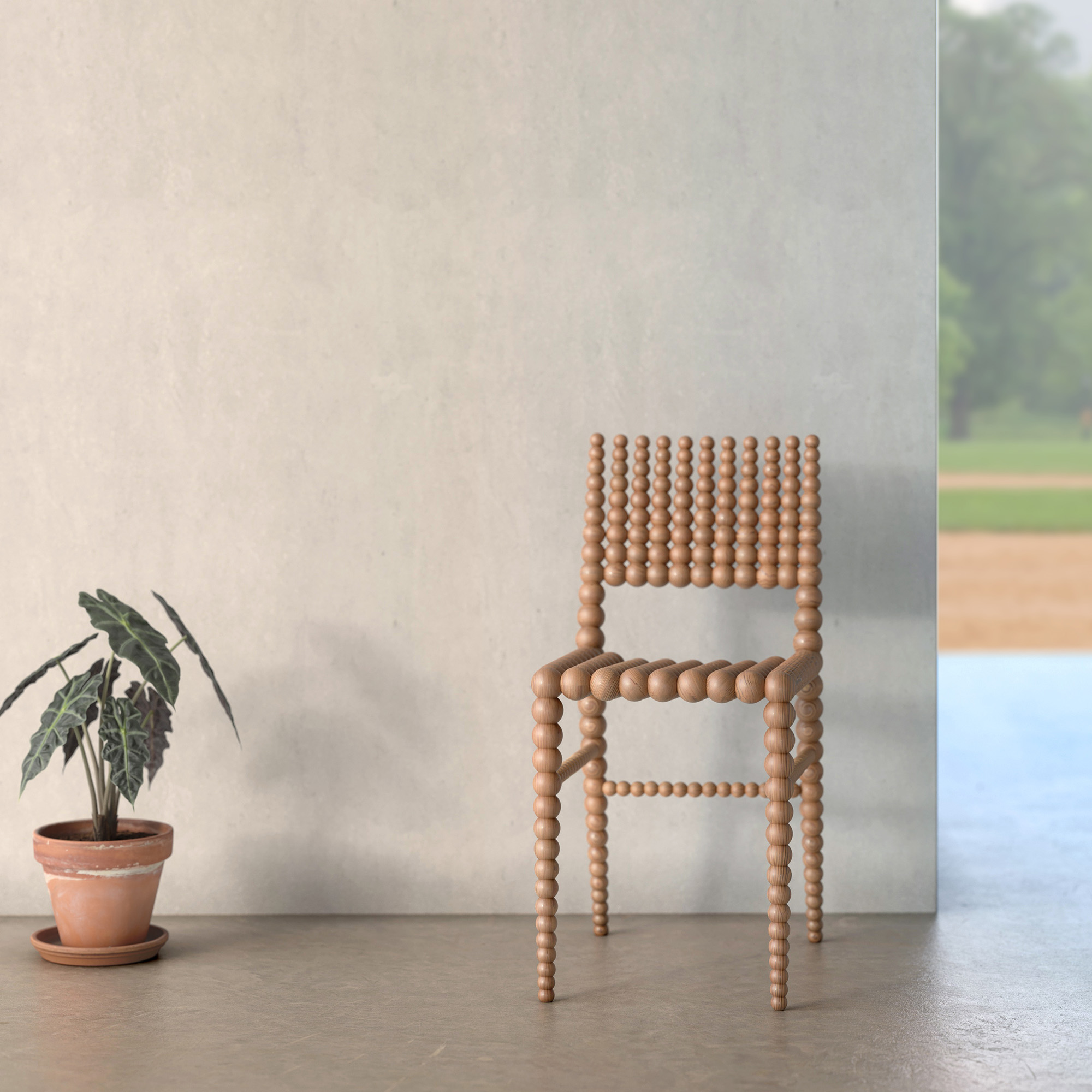 3D visualisatie van de stoel Maria. Een opvallende stoel met een eigentijds uiterlijk en tegelijkertijd een ode aan de Brabantse knopstoel. | ontwerp vanVrienden