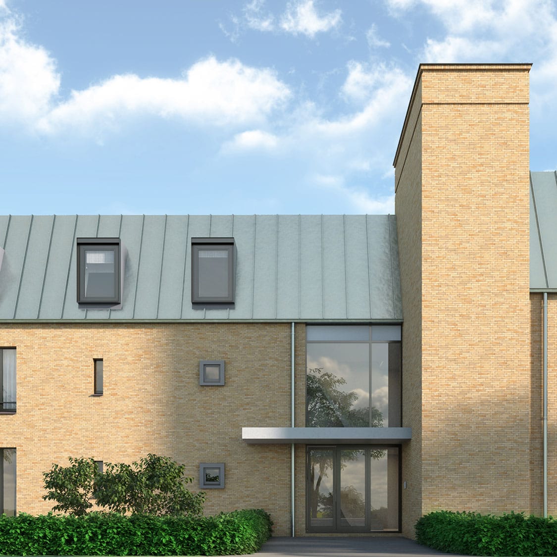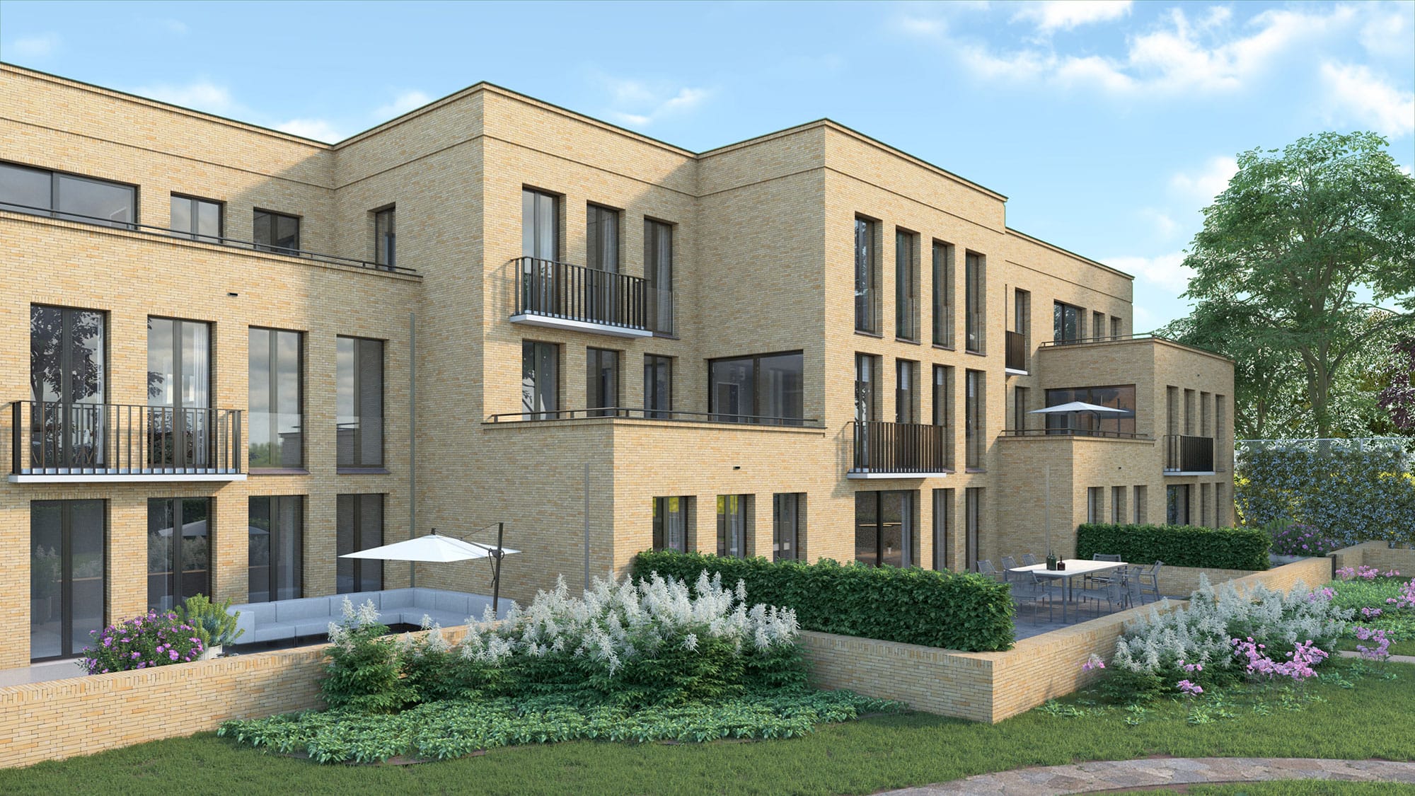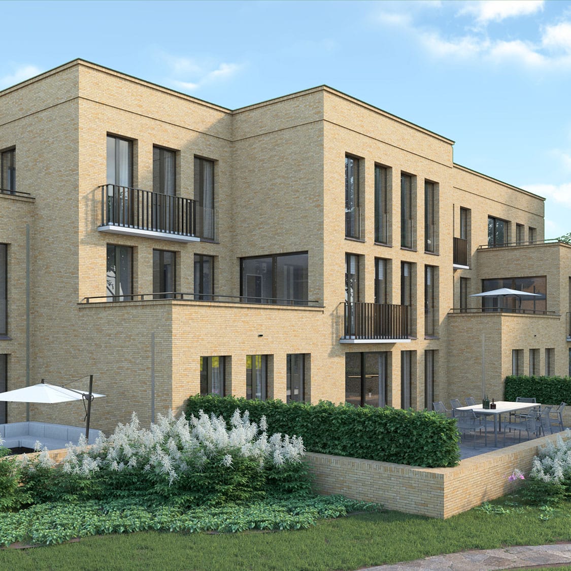 3D visualisatie van de nieuwbouw van Residentie Haspershof. 8 appartementen met een studio in Overpelt, Belgie. | ontwerp: De Twee Snoeken ism Wijnen Architectuur.
